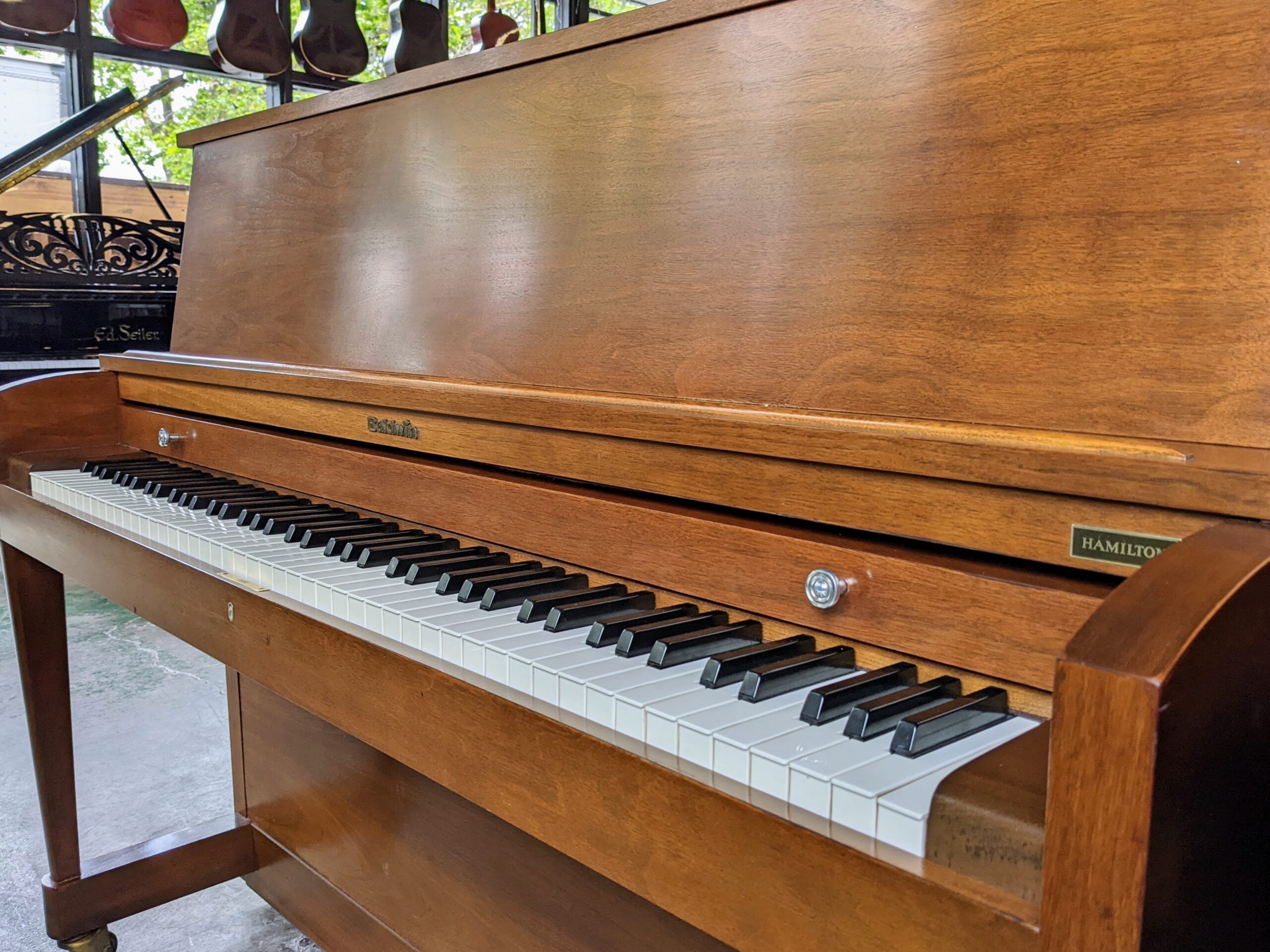 This Baldwin studio upright piano from the 1970s represents the solid American craftsmanship Baldwin was known for during its strong production years. Finished in a warm walnut cabinet, this piano offers a balanced, pleasing tone and dependable performance in a compact studio upright design.